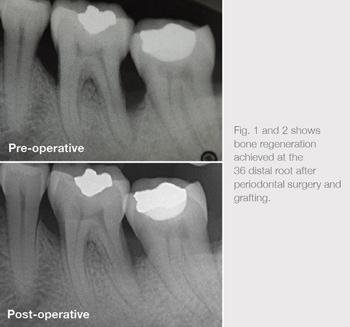 Periodontal examination revealed up to 9mm probing pocket depths at the 36 as well as a deep intrabony defect at the distal aspect. A modern minimally invasive flap design that preserved the papilla was utilized to gain access to the intrabony defect. The tooth was carefully debrided, and the root surface was treated with EDTA. Emdogain gel was then applied and a xenograft (Bio-Oss) was then used to fill the 2-3 walled defect.
