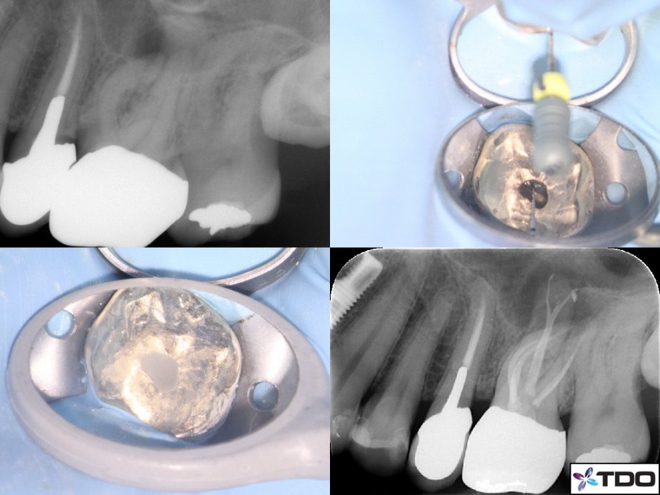 Patient C presented with an acutely painful tooth 26. The tooth had a full gold crown placed a couple years prior and had been asymptomatic up until the recent development of pain. Orthograde endodontic treatment was performed for the tooth over two visits with calcium hydroxide dressing.